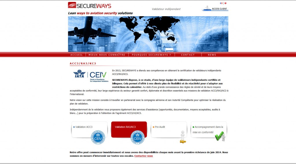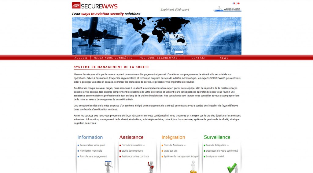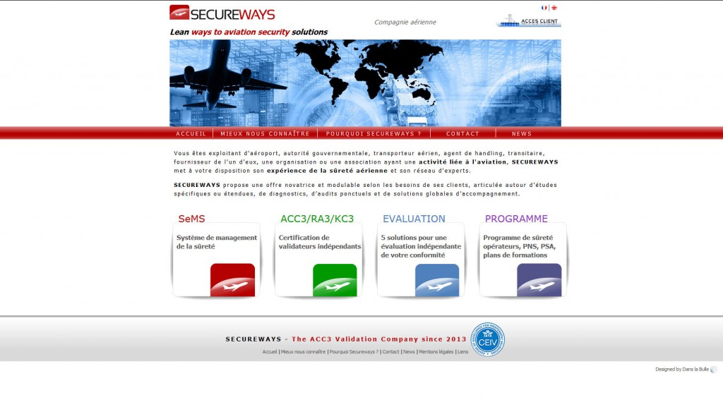 Expert de la sûreté aérienne et son réseau d'experts, Secureways propose une offre novatrice et modulable selon les besoins de ses clients, articulée autour d’études spécifiques ou étendues, de diagnostics, d’audits ponctuels et de solutions globales d’accompagnement.